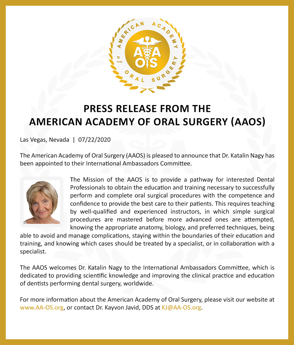 Valamint legutóbb, 2020 júliusában Prof. Dr. Nagy Katalin az egyetlen magyar nagykövete lett az Amerikai Szájsebészeti Akadémiának (American Academy of Oral Surgery).