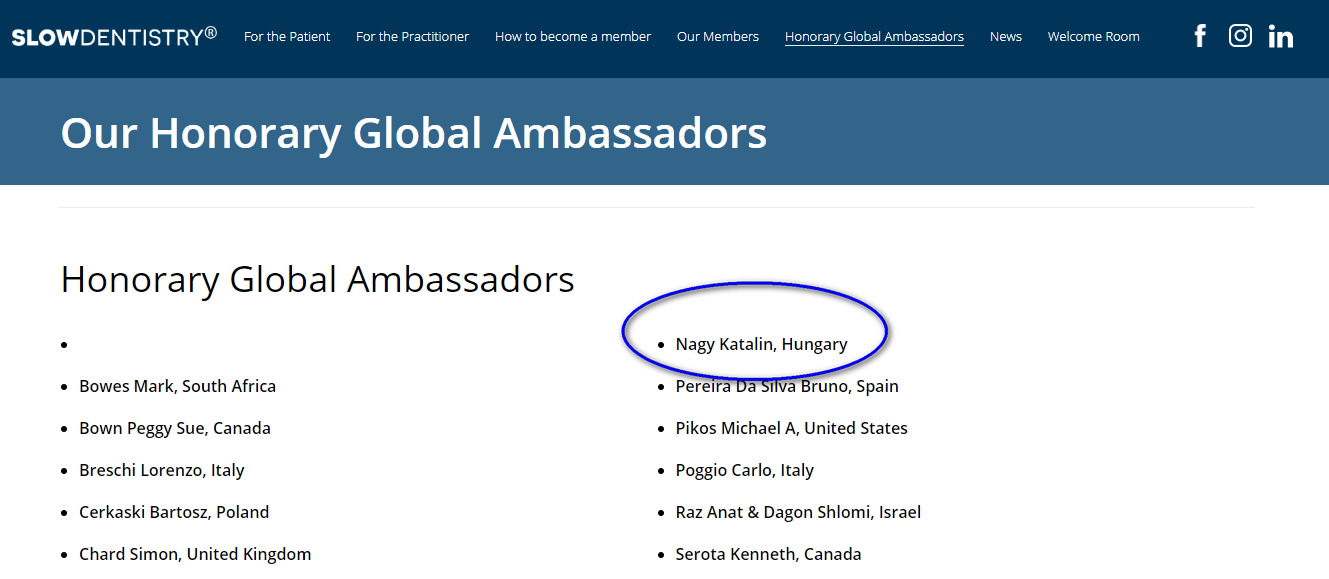 Az utóbbi években ezen törekvések megvalósításához három, világszerte működő egyesület is csatlakozott. 2019-ben a DDS (Digital Dentistry Society), 2020-ban a Slow Dentistry, majd az American Academy of Oral Surgery Magyarországot képviselő nagykövete lett.