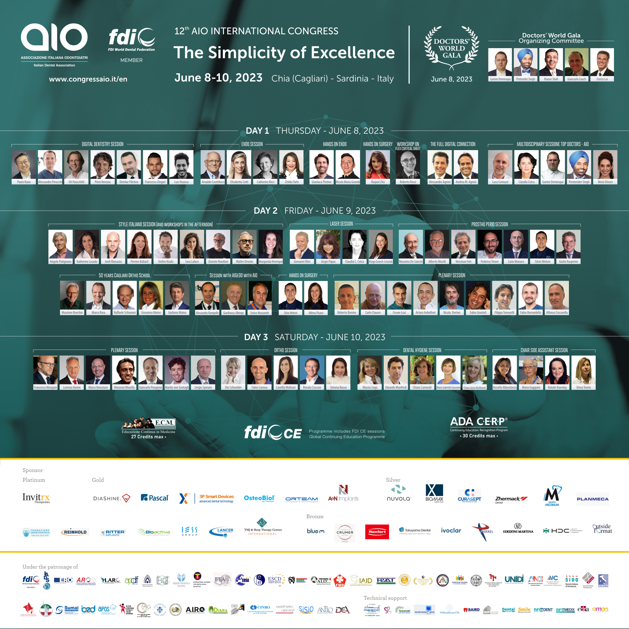 Az Italian Dental Association (AIO, az olasz fogorvosszövetség) 2023. június 8-10. között rendezi meg 12. nemzetközi kongresszusát. A rendezvény, jelmondata szerint, a „kiválóság egyszerűségét helyezi fókuszba.” A kongresszus angol nyelvű honlapja: Welcome - AIO International Congress (congressaio.it) A helyszínen az eseménnyel egyidőben zajlik a 2023-as Doctors’ World Gala, amelynek része egy expo, vörösszőnyeges fogadás, díjátadó ünnepség, élő showműsor, valamint remek lehetőség adódik a kapcsolatépítésre: Doctors World Gala - AIO International Congress (congressaio.it)