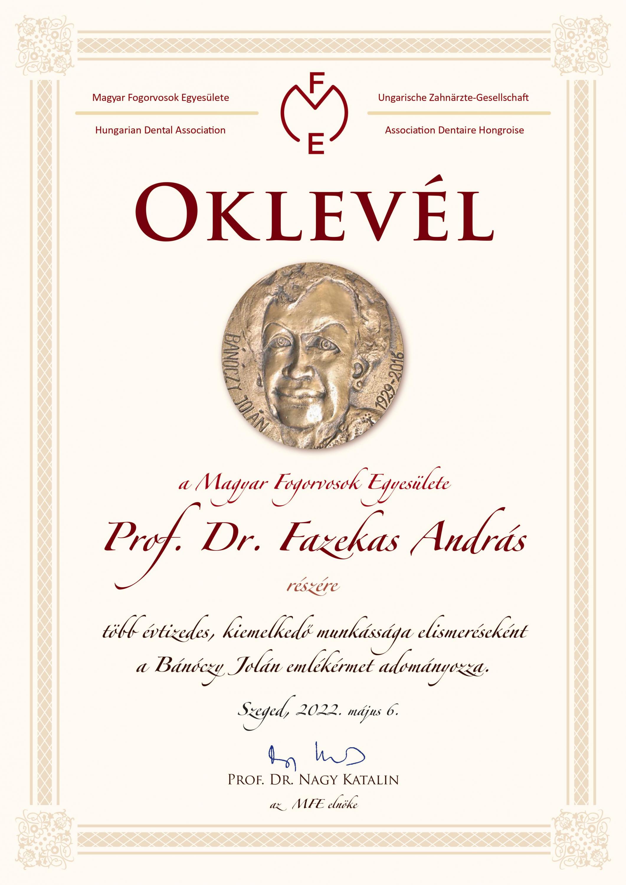 Az emlékérem  2022. május 6-án, a Perspektívák a Paro-Implantológiában és a Komprehenzív Fogászatban konferencia első napján került átadásra, azonban Fazekas András Professzor Úr sajnálatos módon nem tudott személyesen részt venni az átadón.