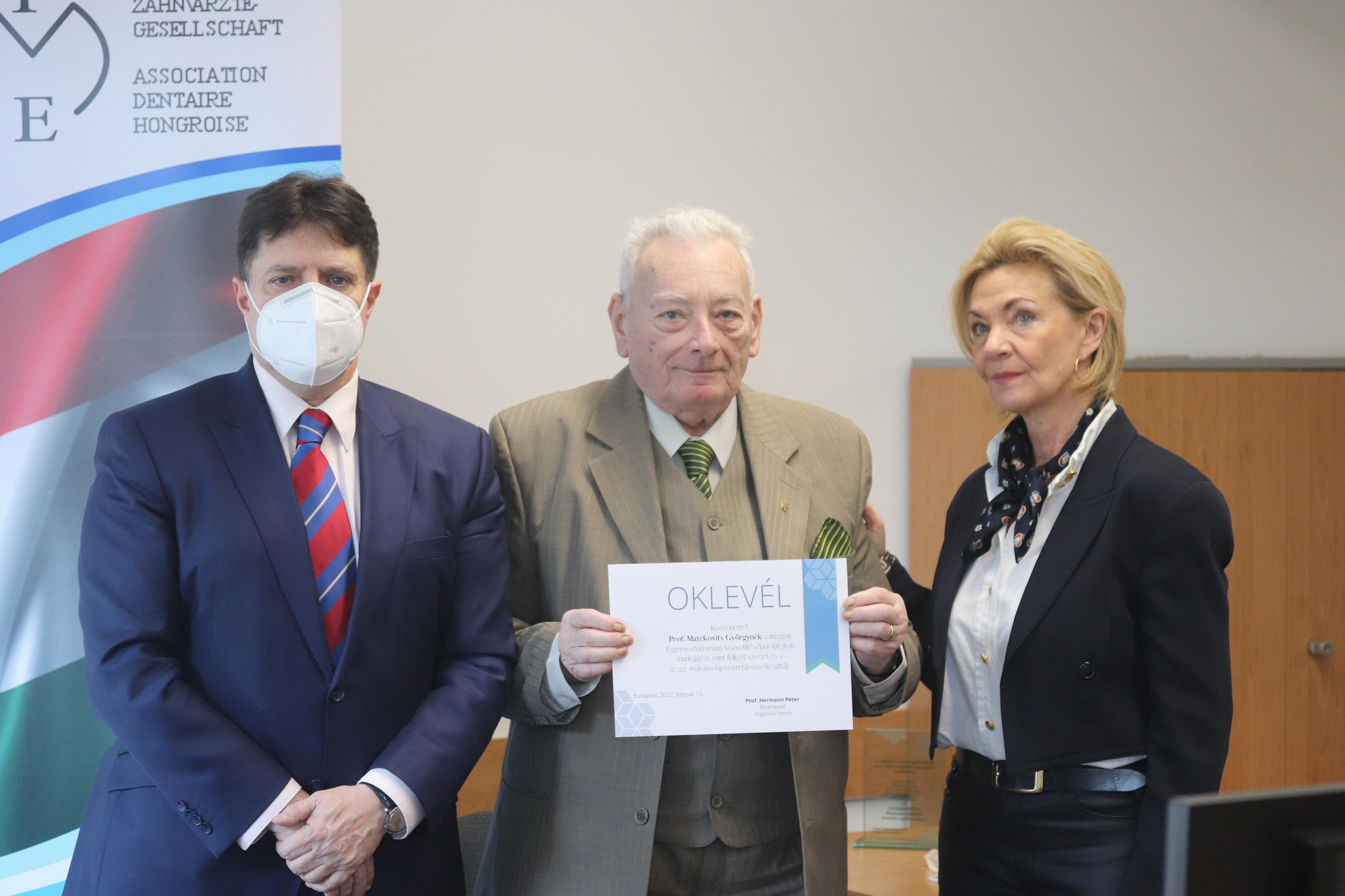 Matekovits Professzor Úr megható köszönőbeszédében mesélt a Fogorvosi Szemle szerepéről saját szakmai életében. Mesélt arról, a magyar nyelven való tanulás, továbbképzés, a fogorvosi szakma magyarul történő művelése hogyan volt számára lehetséges Erdélyben a hatvanas években, melyekhez folyóiratunk hozzásegítette: