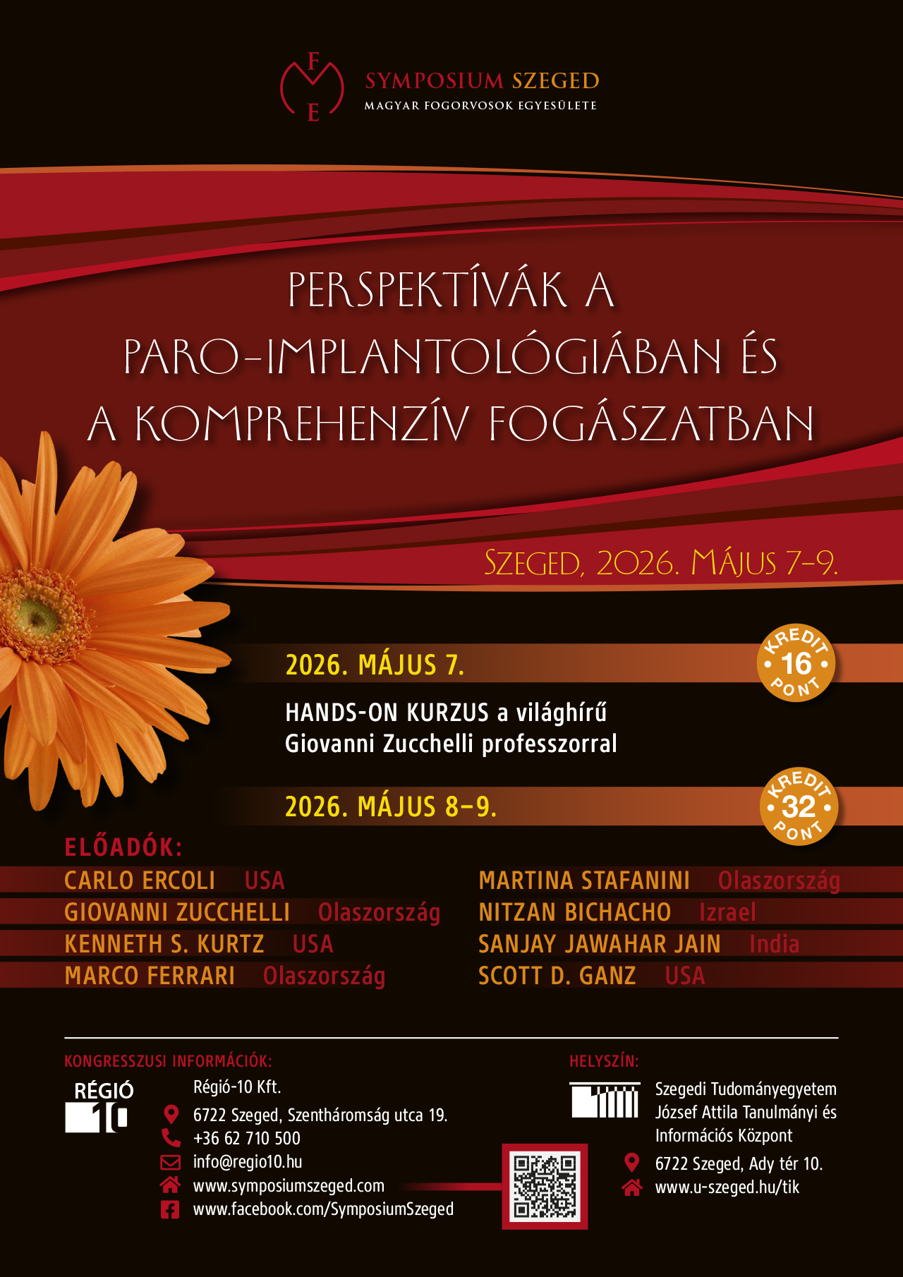 Immár 19. alkalommal kerül megrendezésre a rangos SymposiumSzeged fogászati konferencia Szegeden, 2026. május 8–9. között. A program kiemelkedő hazai és nemzetközi előadókat vonultat fel, többek között: